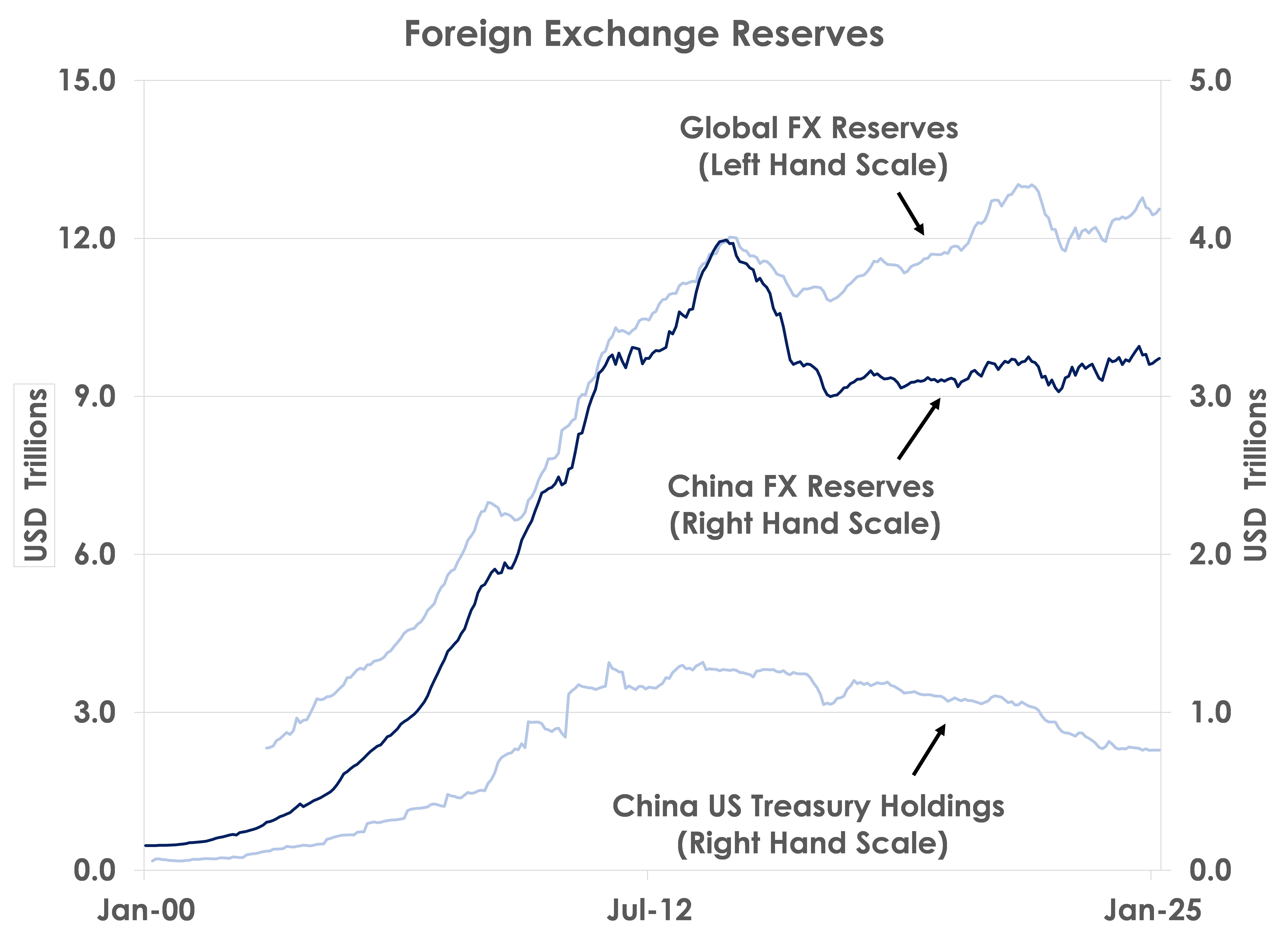 US Treasury securities total USD28.1 trillion according to Federal Reserve (Fed) data, close to US GDP of USD29.3 trillion. Foreign investors hold USD8.5 trillion or 30% of the market as the first chart shows. One the largest holders is the People’s Bank of China. The next chart shows the PBoC holds USD760 billion of USTs according to the US Treasury’s data - unsurprising given China holds the world’s largest FX reserves at USD3.2 trillion, 25% of total reserves at USD12.6 trillion.