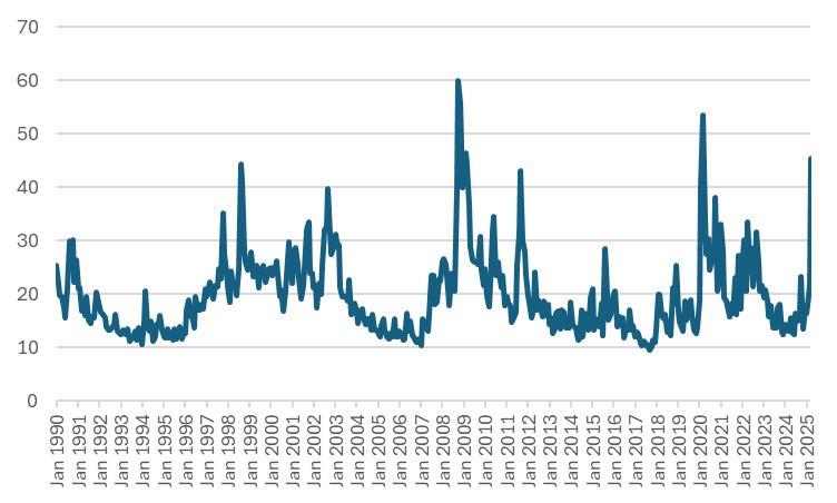 Exhibit 1: VIX index (monthly, Jan 1990 - 5 April 2025)