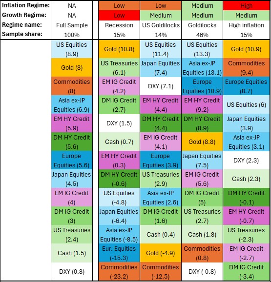 Note: Assets are arrayed in descending performance within the given macro regime (average returns in percent are given in parenthesis). Monthly YoY returns from 2003-2024 (longest period available across all asset classes). Only the 4 macro regimes (of 9) which reach our minimum 4% sample size are shown.