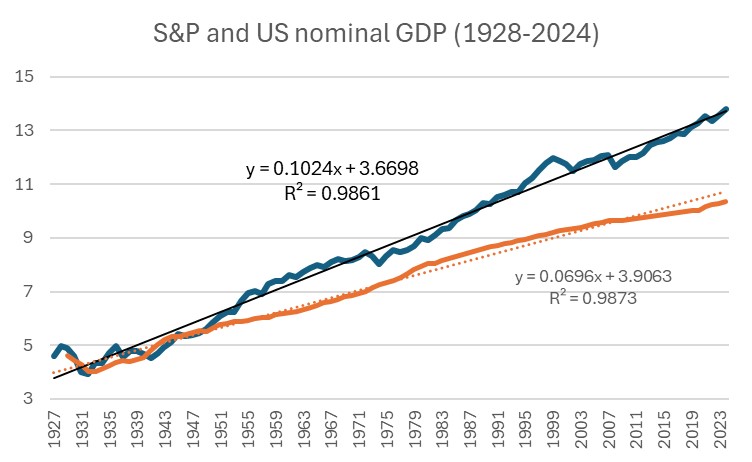 Exhibit 2: S&P 500 Total Returns Index and US nominal GDP (in natural logs, annual observations, 1928-2024)