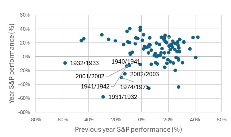 Exhibit 4: S&P 500 Index annual total returns versus previous annual returns (1928-2024)