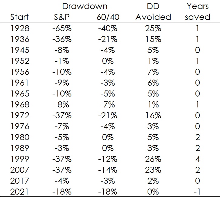 Exhibit 7: S&P 500 Index vs a portfolio of 60% S&P 500 + 40% UST drawdowns, comparing the drawdown and time averted (1928-2024)