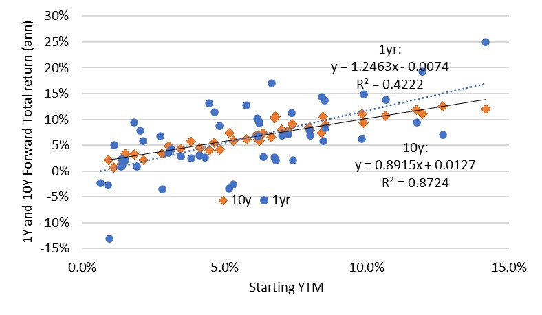 Exhibit 8: YTM and subsequent UST Index total returns over 1 and 10 years (annual data, 1973-2024)