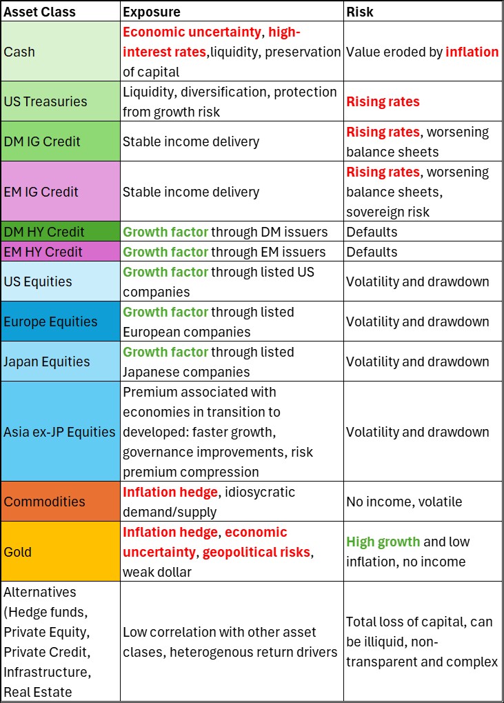 Exhibit 9: Key return drivers and risk across asset classes (macro factors highlighted in red and green)